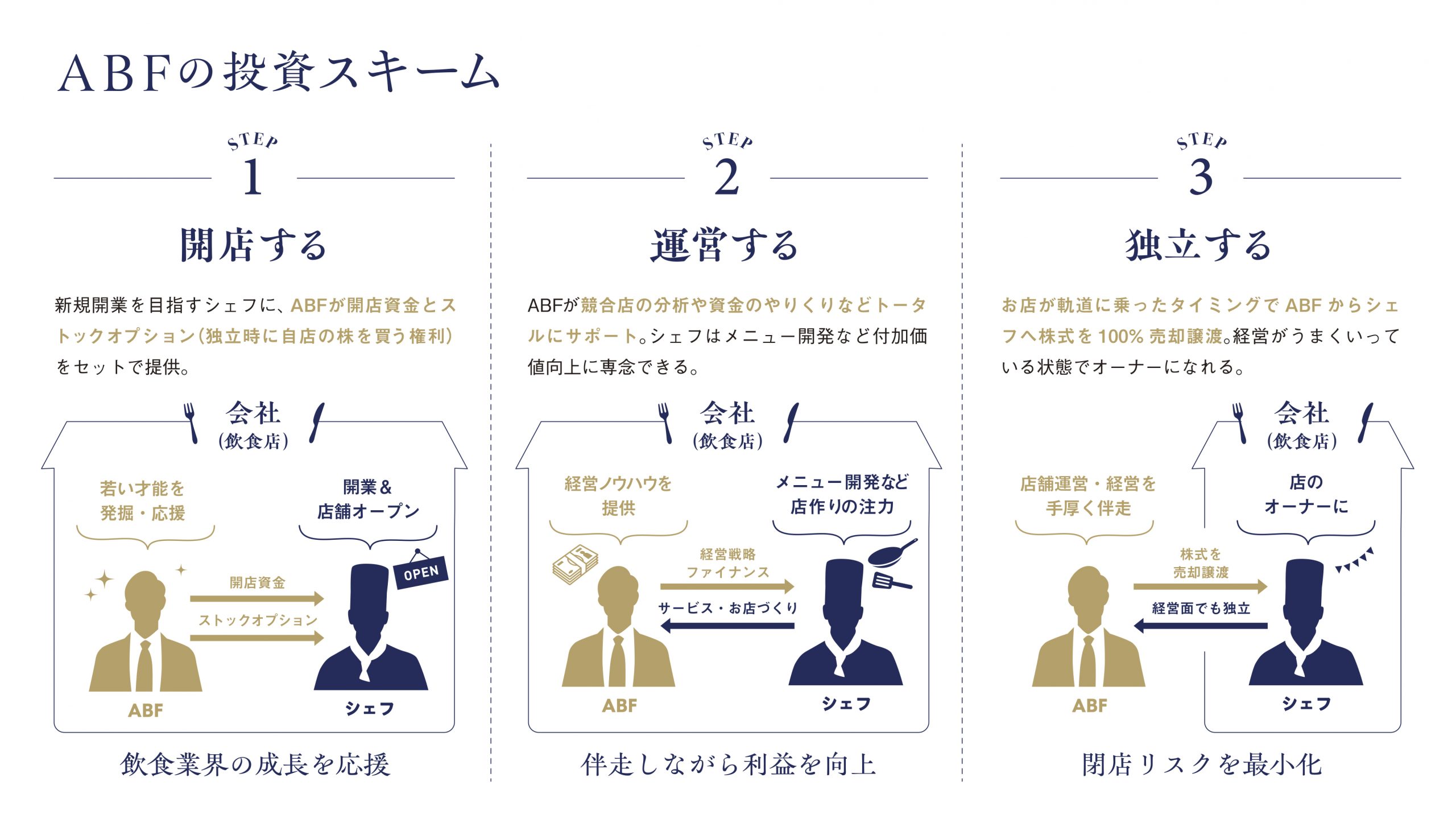 ―職人の”完全”な独立を実現するため、熊原氏が独自に考案した手法が、店舗責任者であるシェフ本人のMBO(マネジメント・バイアウト)を前提とした投資スキームだ。ABF Capitalは、独立を目指す料理人のために会社を設立し、株式を保有する。そして開店資金とともに、ストックオプションを料理人に付与する。開店後は、ABF Capitalが持つ経営ノウハウを駆使して店の運営を全面的にサポートするほか、金融機関との融資交渉も主導するなど、店舗運営面・資金調達面ともに長期的な手厚い支援を行っている。その後、経営が軌道に乗り、安定した収益及び利益を上げられるようになった段階で、料理人自身が株主の新会社を設立する、既存会社の株式を料理人に対して譲渡する、ストックオプションの行使によるMBOを実施して料理人がすべての株式を買い戻す、などの手法を複合的に用いることで、本当の意味で、料理人が自分の店のオーナーになれる。ちなみに、イグジット後であっても、要望があれば金融機関との融資交渉等のサポートも行うという手厚さである。