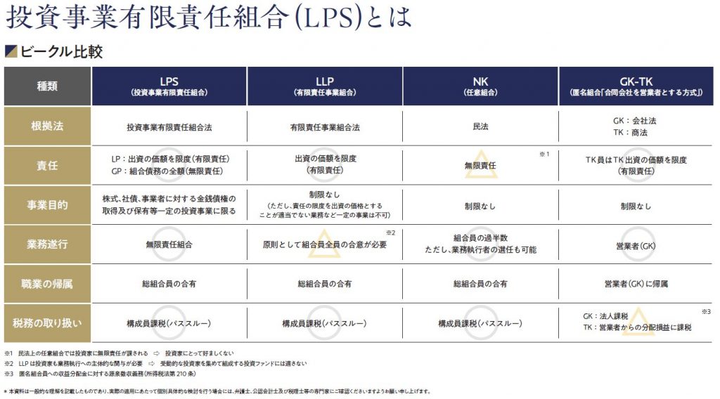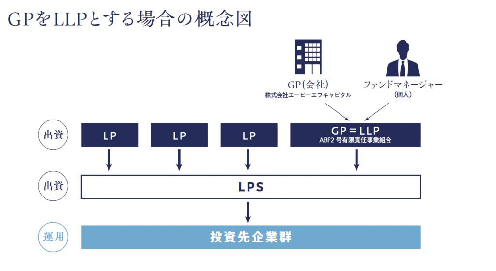 2号ファンドで採用されたLPSは無限責任組合員(General Partner、以下GP)であるファンド運営者と有限責任組合員(Limited Partner、以下LP)である投資家で構成される。1号ファンドで採用された任意組合によってVCを組成する方法は、投資家も無限責任を負うため投資家視点ではあまり好まれず、あまりポピュラーな方法とは言えない一方で、2号ファンドで採用したLPS方式はGPが無限責任で運営を担い、LPが出資額を上限とする有限責任で資金を提供することで、投資先企業の円滑な資金供給と投資家のリスク低減を両立するストラクチャーであり、任意組合同様の税制上のメリットも得られるものである。