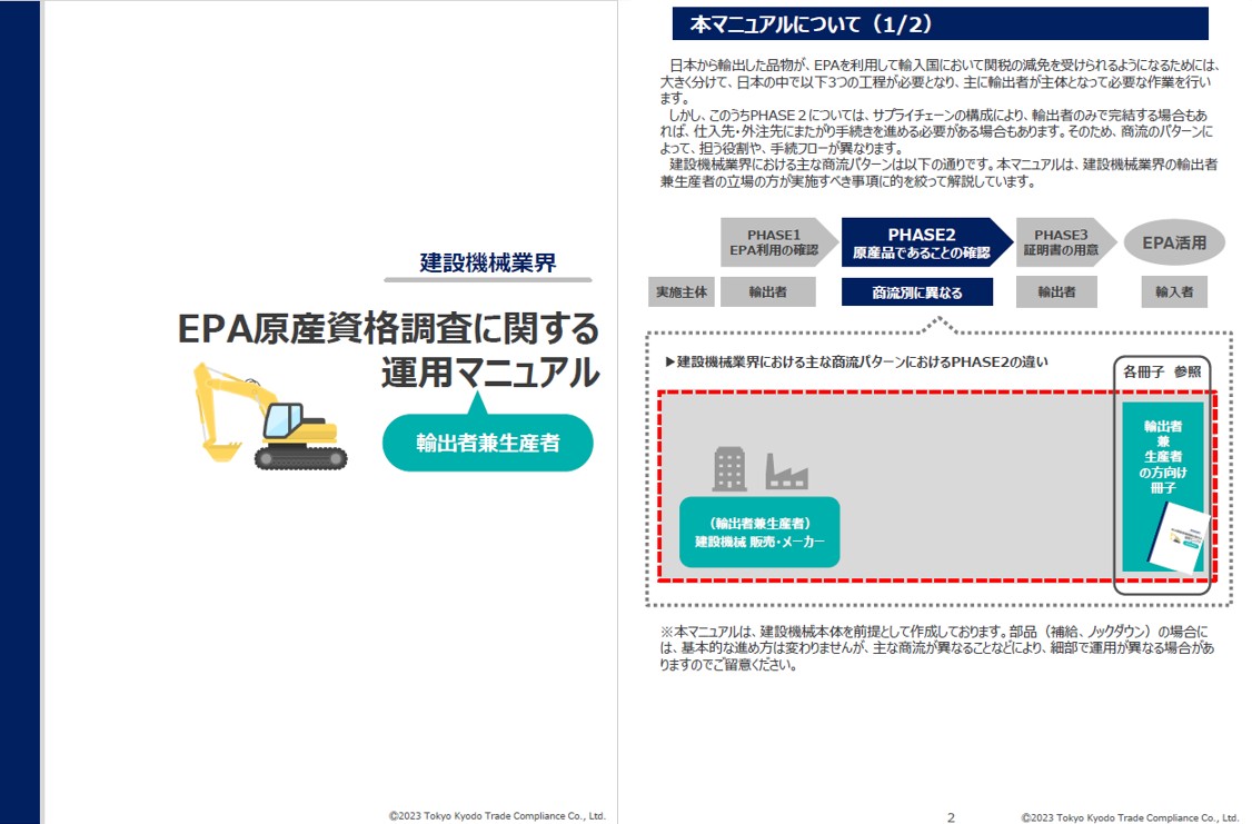 建設機械業界向けに、EPA/FTAを利用するまでに必要なフロー、業務を業界の製品特性、並びにサプライチェーン上の役割を踏まえて、必要な事項に絞って解説しています。