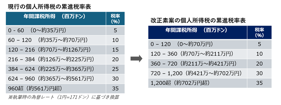 現行の法律では、2020年以降、基礎控除と扶養控除はそれぞれ(年次)132百万ドン(約77万円)と52.8百万ドン(約31万円)とされています。今回の改正案では、基礎控除と扶養控除はそれぞれ年次で186百万ドン(約108万円)と74.4百万ドン(約43万円)と規定されていますが、この各控除額は物価指数、経済状況等を考慮したうえで今後適宜調整する条項も規定されています。現行の控除金額が実際の経済状況を反映していないなどの声があり、このような控除額を調整する規定は現在生じている様々な議論を根本的に解決できると期待されています。